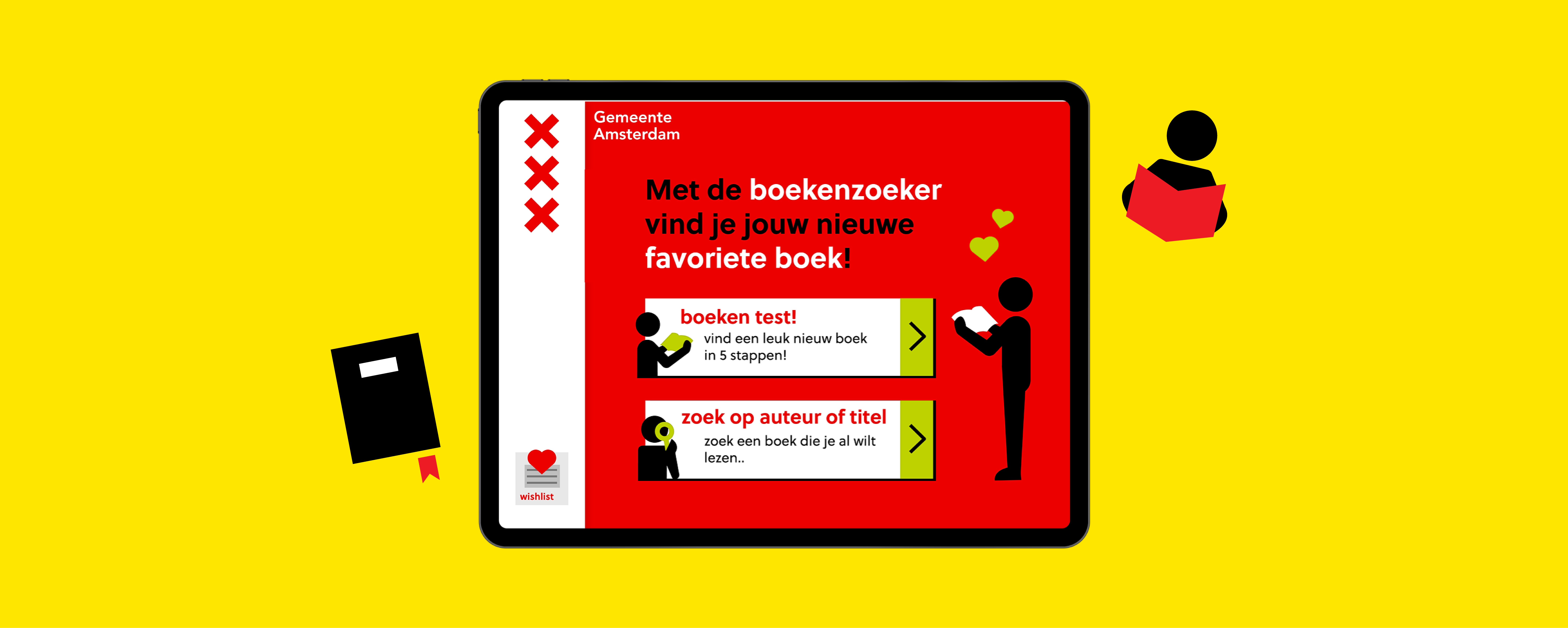 Ontwerp een interface voor een iPad Air/Pro in de bibliotheek in de huisstijl van de Gemeente Amsterdam. De gebruiker moet de velen boeken kunnen filteren en vervolgens op kunnen slaan in een verlanglijst. Zo kan hij ze in de bibliotheek vinden!